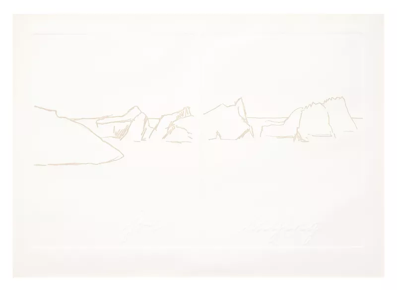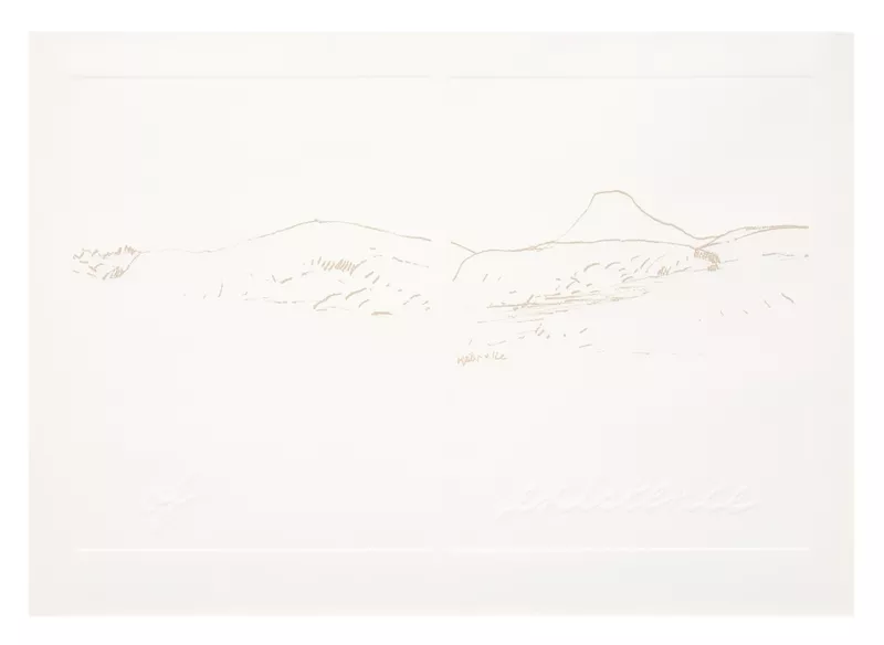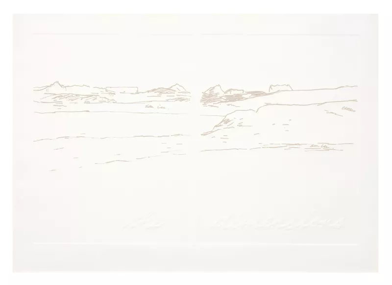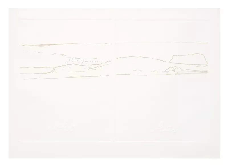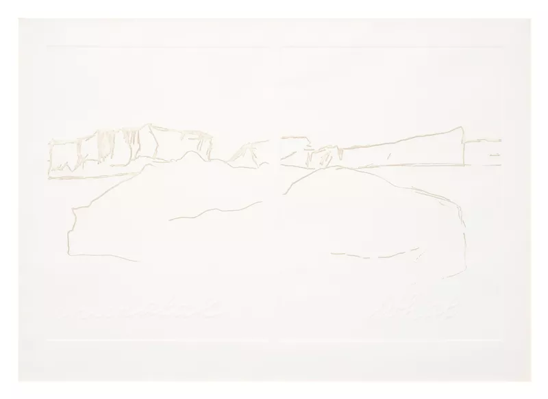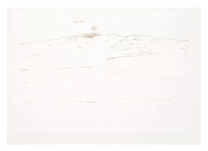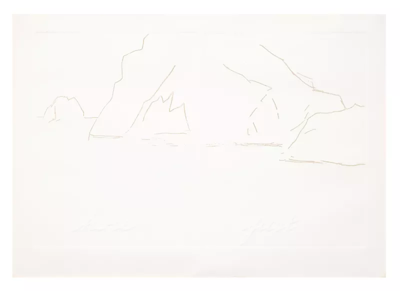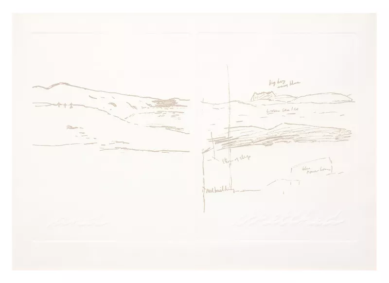 Bea Maddock’s set of forty photo etchings, Forty Pages from Antarctica, and artist book, To the ice, were created after Maddock’s residency in Antarctica in 1987. Both works formally adapt the conventions of early explorers, of journal-keeping and topographical drawing, to record the voyage, yet Maddock’s tone is uncertain rather than definitive. On each sheet Maddock pairs her sketch of the coastline with a word. Over forty pages she makes the radical unfamiliarity of environment her subject: ‘Are we here just for saying “ice”, “iceberg”, “ice floe”, “ice cap”?’ She also asks a question about the landmass itself: ‘who has marked out the dimensions’. Maddock addresses the impossibility of visual and written language in such an extreme place, her words emphasising the alien ‘other’ landscape, a place with no human history.