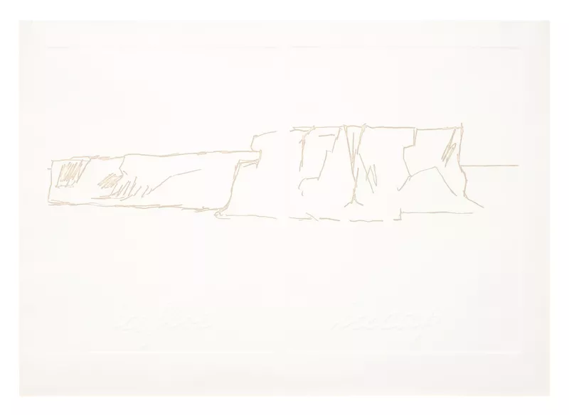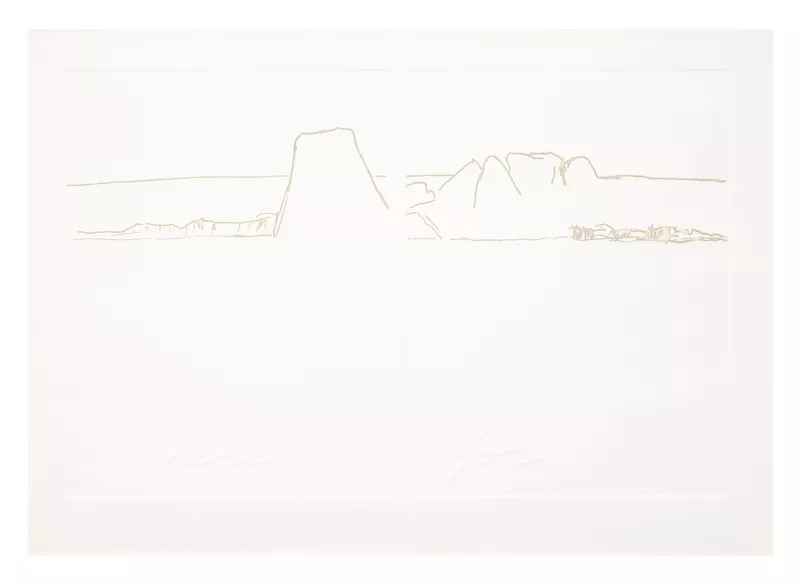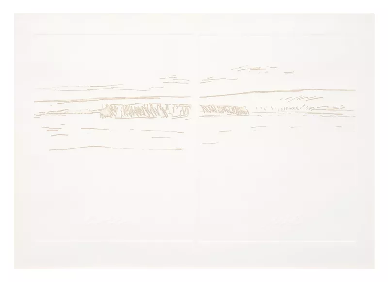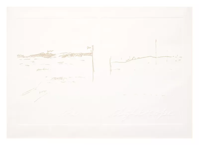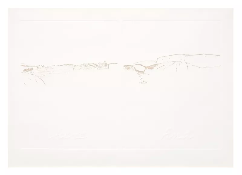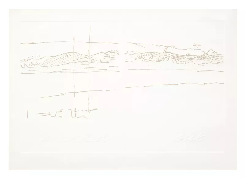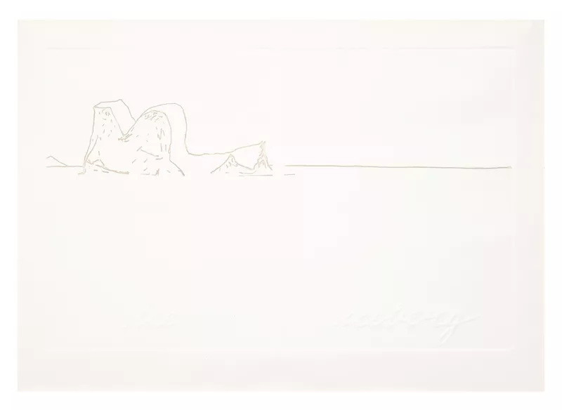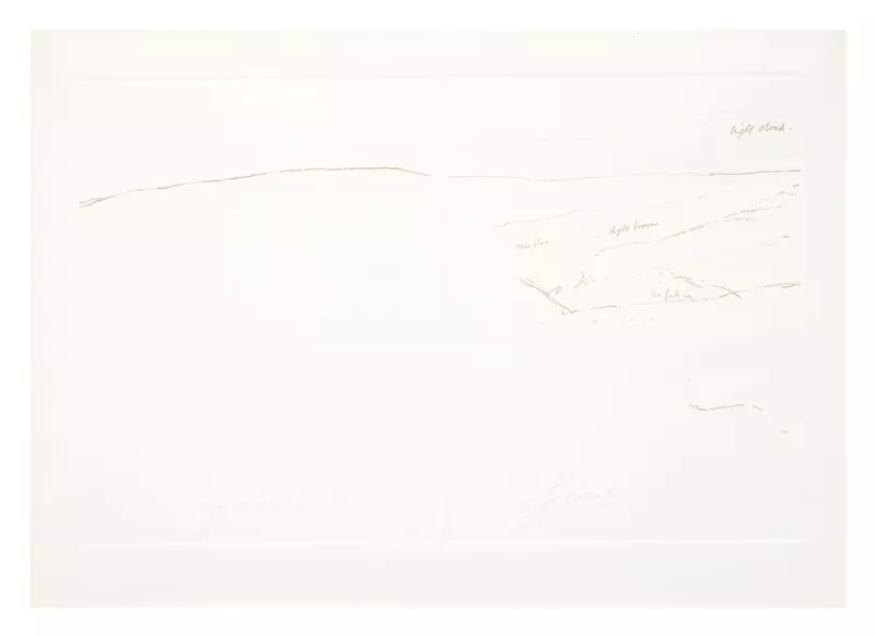 Bea Maddock’s set of forty photo etchings, Forty Pages from Antarctica, and artist book, To the ice, were created after Maddock’s residency in Antarctica in 1987. Both works formally adapt the conventions of early explorers, of journal-keeping and topographical drawing, to record the voyage, yet Maddock’s tone is uncertain rather than definitive. On each sheet Maddock pairs her sketch of the coastline with a word. Over forty pages she makes the radical unfamiliarity of environment her subject: ‘Are we here just for saying “ice”, “iceberg”, “ice floe”, “ice cap”?’ She also asks a question about the landmass itself: ‘who has marked out the dimensions’. Maddock addresses the impossibility of visual and written language in such an extreme place, her words emphasising the alien ‘other’ landscape, a place with no human history.