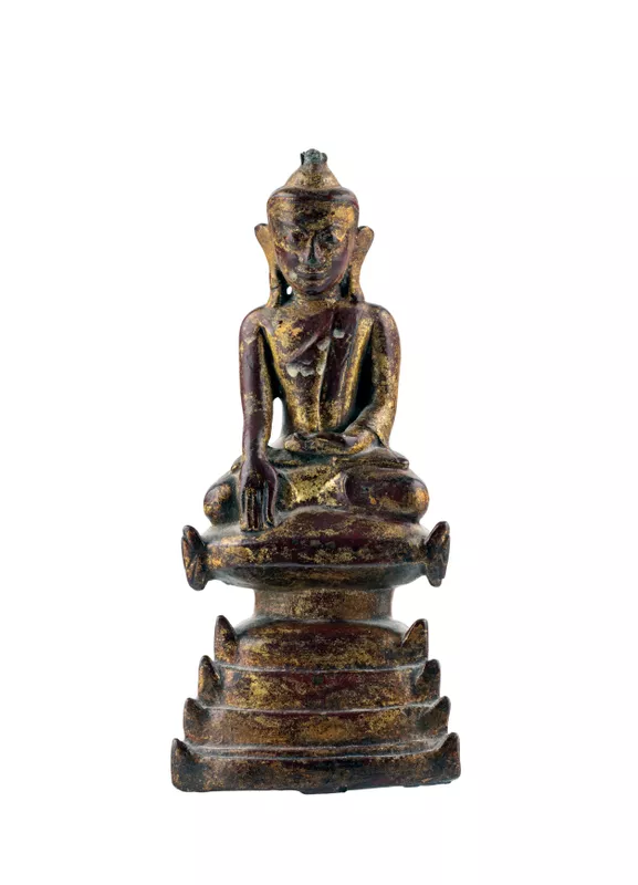 Gautama Buddha, calling the earth to witness, seated on high throne