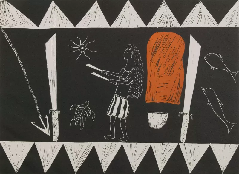 Djalinda (Dulamari) Yunupiŋu 1954linocut printed in orange & black inks on paperAccession no: 20078G69