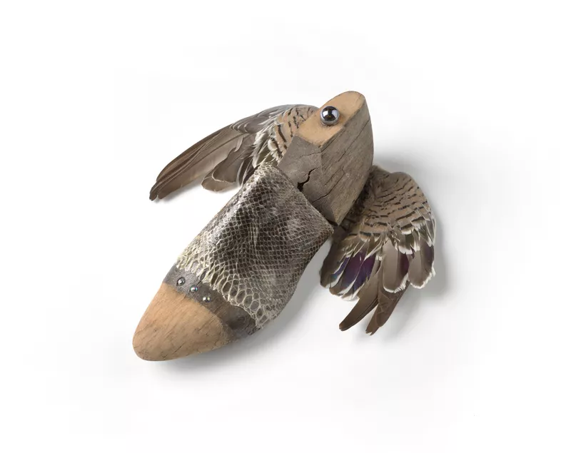 c.2007bird wings, snake skin, glass ball, plastic beads, wood on wooden shoe lastAccession no: 20243S15