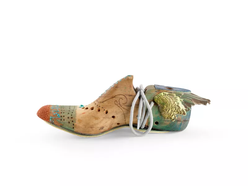 c.2007bird wings, synthetic polymer paint, plastic bead, nylon shoelace, leather insole on wooden shoe lastAccession no: 20243S14 -