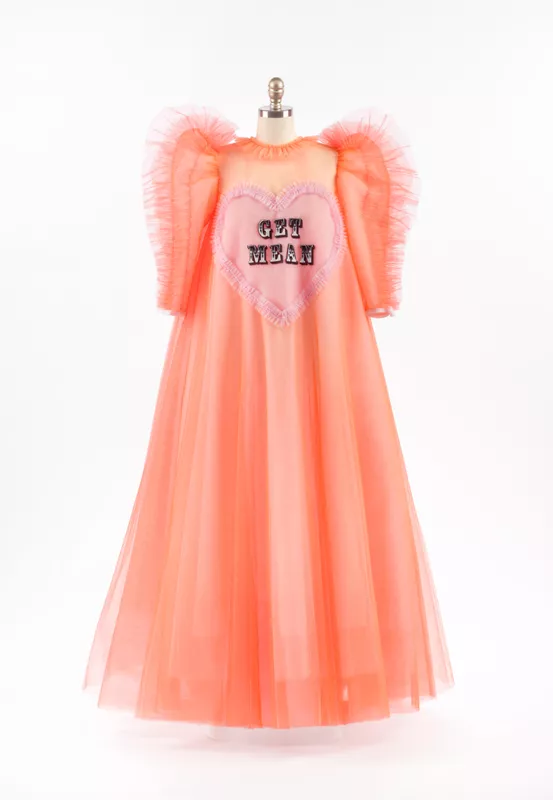 A voluminous A-symmetrical silhouette, this pink tulle gown is adorned with the text ‘GET MEAN’, which has been applied to a frilled love-heart background. Designed by Viktor Horsting and Rolf Snoeren of Dutch fashion house Viktor&Rolf, it is from the duo’s 2019 Spring haute couture collection, Fashion statements. This collection included an array of tulle gowns in exaggerated proportions and similarly carried witty and wry slogans drawn from the world of contemporary fashion and social media. Alluding to Western ideals of femininity, this gown references an historic, overly flounced, women’s dress but with the surprising addition of the text ‘GET MEAN’, a rebuttal of social norms of femininity.