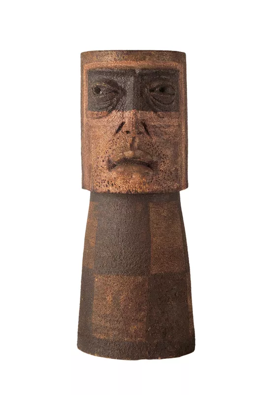 Born in Glasgow in 1932, Leckie studied ceramics at the Glasgow School of Art before moving to Australia as a young man, in 1955. The following year he began teaching at the South Australian School of Arts and Crafts, as it was then known. Head pot dates to this period in his career and features a solemn masculine face hidden within the checkerboard pattern and double cylindrical built form.