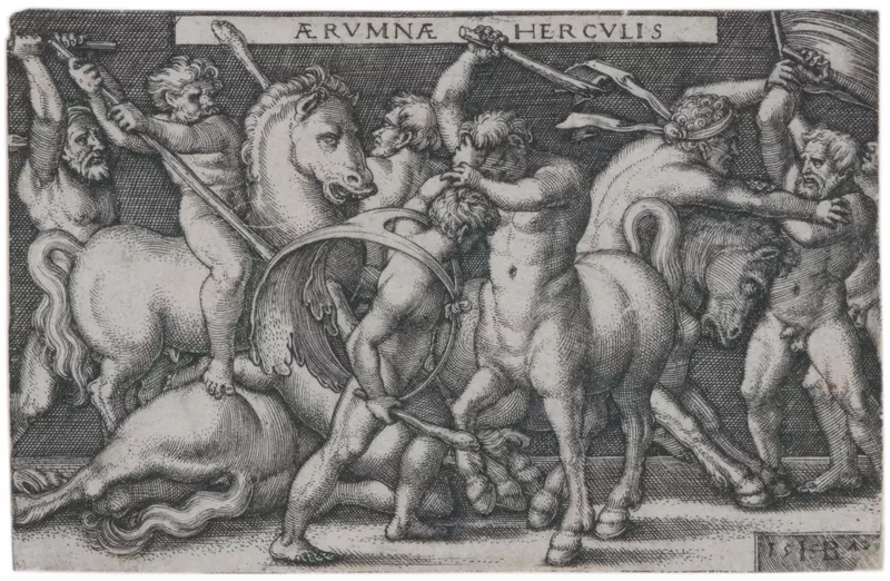 As can be seen from this set of plates, several of Hercules’s foes were monstrous creatures and included Cerberus, the multi-headed dog that guarded the entrance to Hades; the Lernaean hydra, a water snake, also multi-headed and with the ability to grow two more heads if one was cut; and the massive Nemean lion, whose fur was impenetrable to mortal weapons.