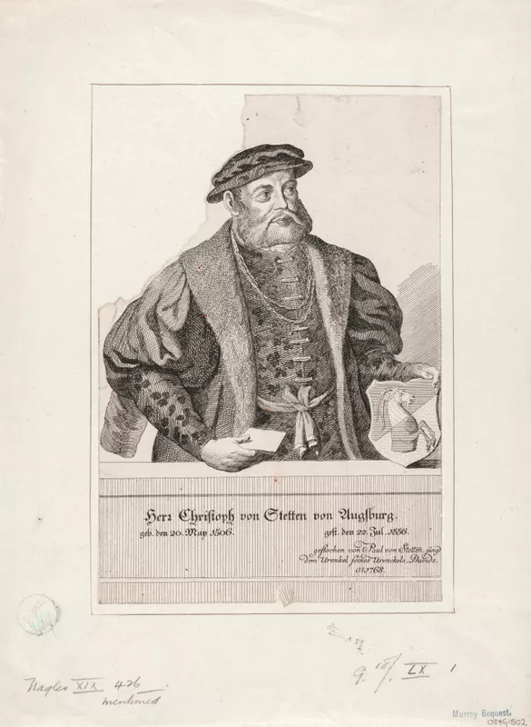 - Signed and dated, engraved in margin of plate, l.r. "gestochen von Paul von Stetten, jüng./dem Urenkel seines Urenckels, Davids, /Ao. 1768.".