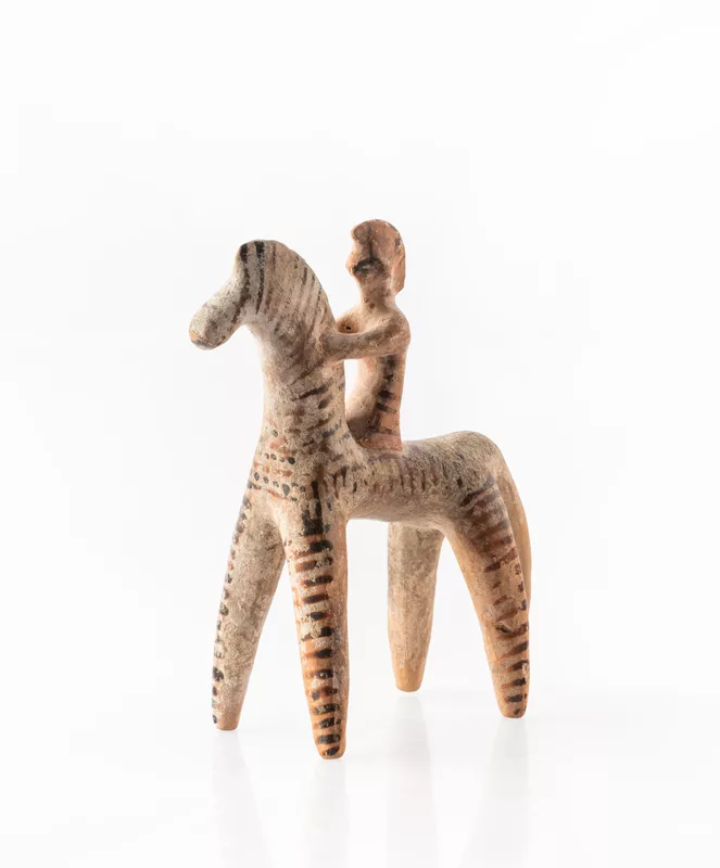 Such horse and rider figures were popular grave offerings during the sixth century BCE in Boeotia, a region of ancient Greece near Athens. Horses were beyond the means of common folk, and the figurine probably indicates the dead man’s social, financial and political status. His helmet also identifies him as a warrior – a cavalryman, above the standing of the regular hoplite foot soldier.