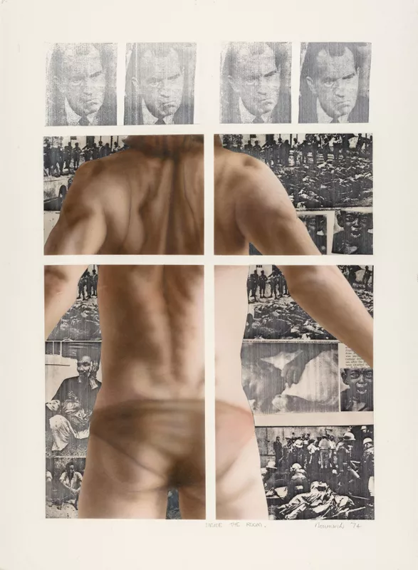 In 1973 and 1974 Ann Newmarch’s work become overtly political, reflecting the activism flourishing in Australian society at that time, as well as ideas gained from her completing the course Politics and Art at Flinders University in 1974. This course was established by Newmarch’s partner Brian Medlin, Professor of Philosophy at Flinders University. Many of Newmarch’s works from 1974 embraced a strong Anti-American attitude and expressed her helplessness and frustration with world problems, including the Vietnam War. In this work, images of President Nixon are contrasted with graphic newspaper images of war and death. While American and Australian military involvement in the Vietnam War had ceased, for Newmarch, the war remained a symbol of America’s unwanted involvement in other countries, and Nixon, a symbol of American corruption.