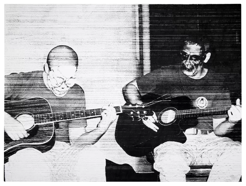 This work from 2010 belongs to a series that deals with American soldiers as they celebrate Halloween in the combat zones of Iraq and Afghanistan. Depicting a moment of recreation (the ‘intermission’ of combat as the work’s title states), it shows the soldiers playing guitars dressed in costumes that highlight symbols of death, with one wearing a skeleton mask and the other a mask of Frankenstein. The jarring juxtaposition of the guitar-playing soldiers in their masks underscores the permeation of violence into all facets of life – including the realm of the creative – on the front line, in the ‘theatre of war’.
