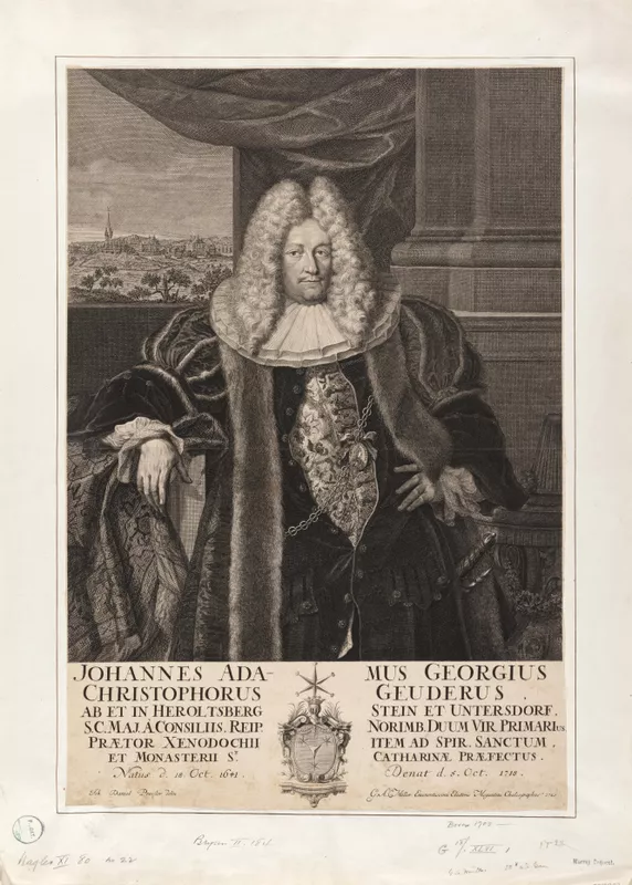 - Signed and dated, engraved in margin of plate: l.r., "G.A. Muller Eminertissimi Electoris Moguntini Chalcographus. 1720."; l.l., "Joh. Daniel Preisterdelin:".