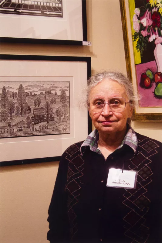 Lidia beside her work at an exhibition of the Royal South Australian Society of Arts