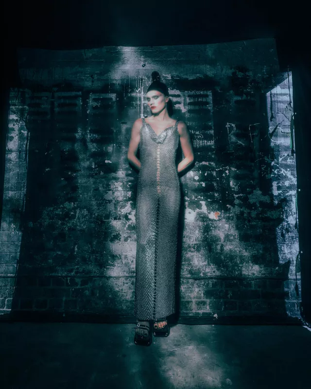- (a) Dress: hand-linked steel chain-mail (b) Choker: cast steel links with over-woven steel chain, leather ties (c) G-string (d) Shoes: Bovine patent leather upper, pigskin lining, chrome plated rivets, rhinestone buckles, NZ Pine platform covered in bovine patent leather (e) headress hand-linked steel chain-mail