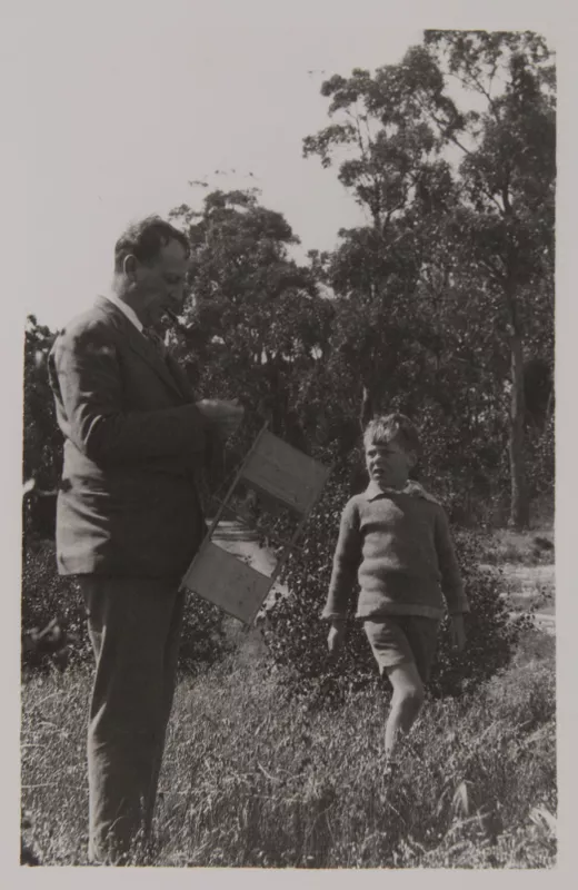 Man and boy with box kite