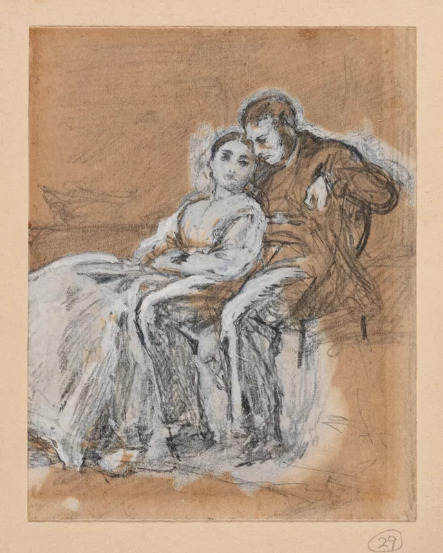 - pencil, white gouache on buff paper mounted on cardboard