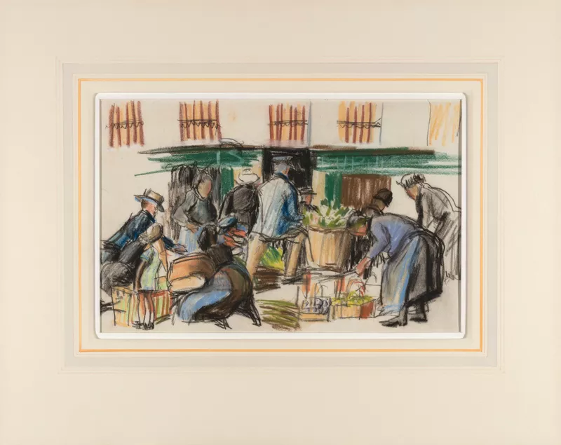 This pastel of a market in Montreuil-sur-Mer, France was created during Kathleen Sauerbier’s time abroad. In 1925, Sauerbier travelled aboad the Maloja to London with her friend and fellow artist Audrey Hardy and would remain in Europe for two years before returning to Adelaide in January 1928. Her time abroad was spent studying at the Central School of Art in London and travelling through France. Sauerbier and Hardy would spend three weeks in the Montreuil-sur-Mer area painting en plein air. This work titled Market, Montreuil-sur-Mer is from a collection of scenes rendered by Sauerbier capturing the activity of a bustling French open air market. Sauerbier depicts market goers in traditional dress surrounded by stalls and baskets filled with produce and flowers.