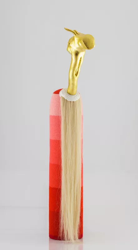 - hand-crocheted lambswool, hand-turned Japanese birchwood, sequins, human hair, gold leaf, gesso, synthetic polymer paint and fig tree branch