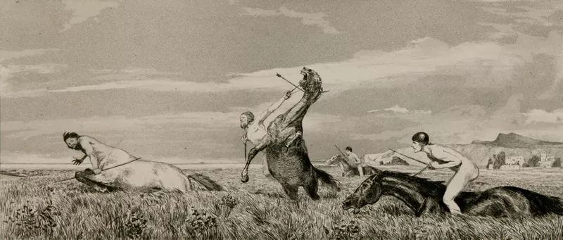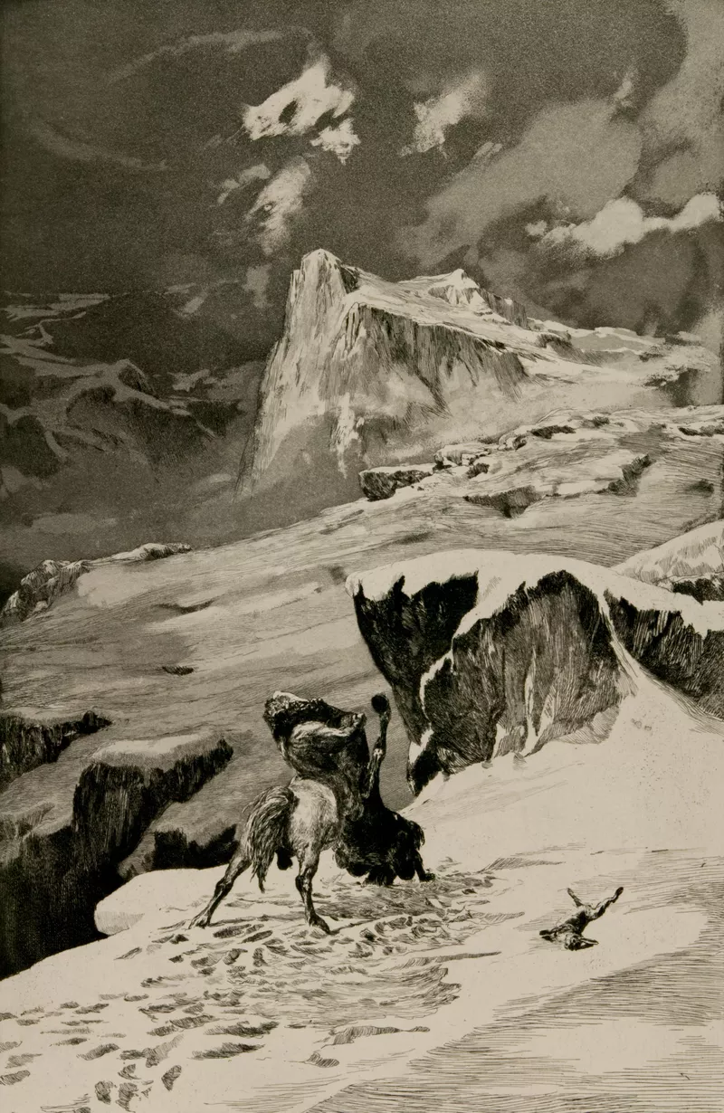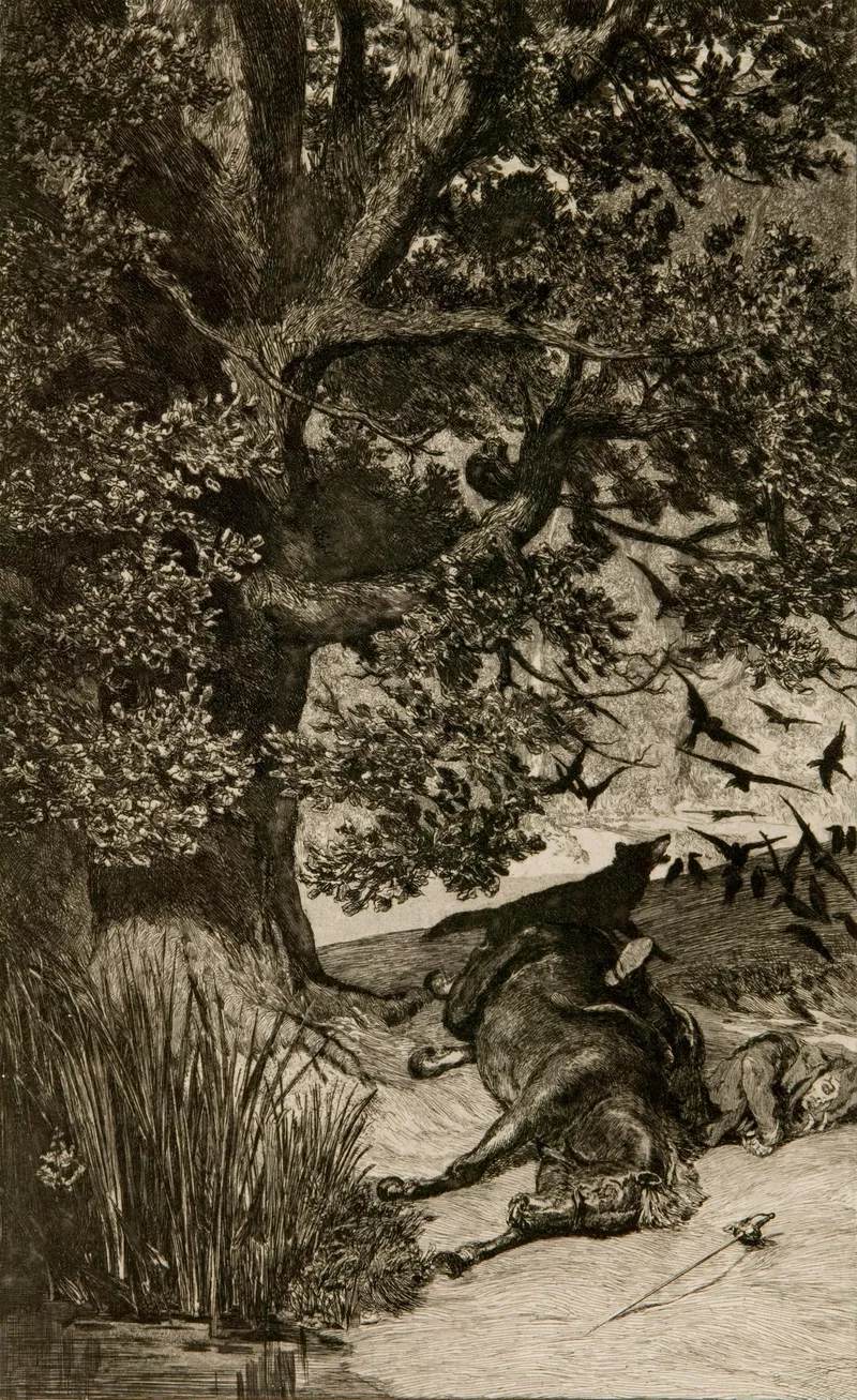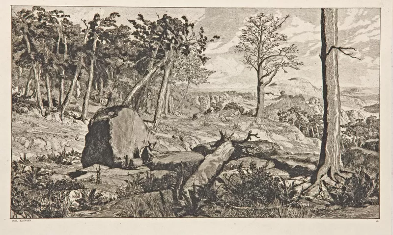 Intermezzi is a musical term for an interlude played between parts of a song or between the acts of a drama, and Klinger’s use of it is open to interpretation. The prints in this series do not appear to present an identifiable narrative. Rather, Klinger appears to be interested in creating a sense of tension through the associations the imagery evokes in the viewer. The works are united by their depiction of the natural world, which is threatening and domineering. Death is ever-present.