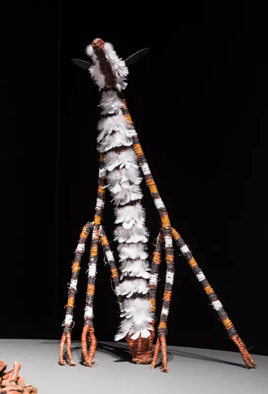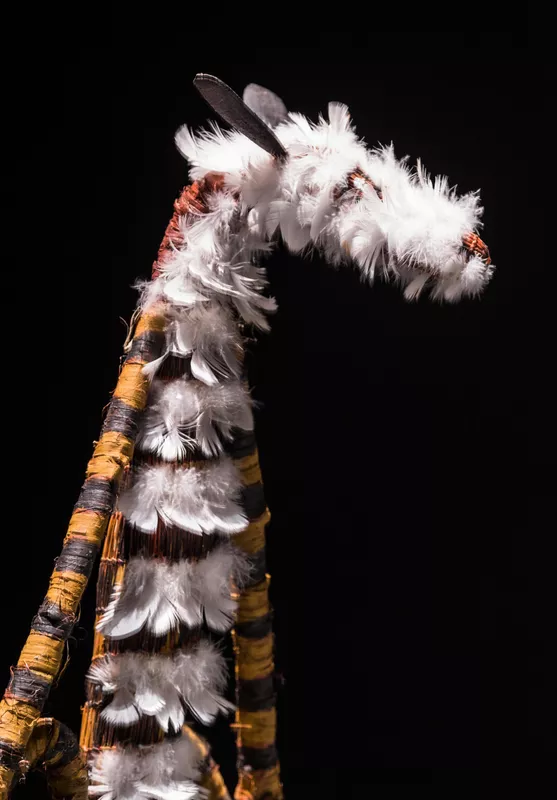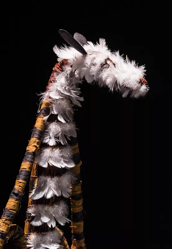 - wood, Sulfur-crested Cockatoo feathers (Cacatua galerita), earth pigments, fibre, digital video with sound