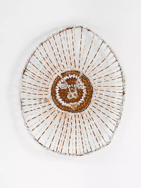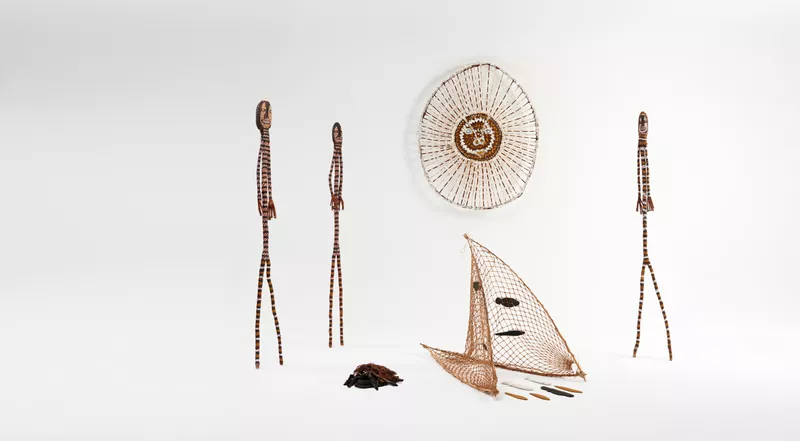 pandanus (Pandanus spiralis), kurrajong (Brachychiton populneus), paperbark (Melaleuca quinquenervia), feathers, rocks, sand, earth pigments, natural dyes