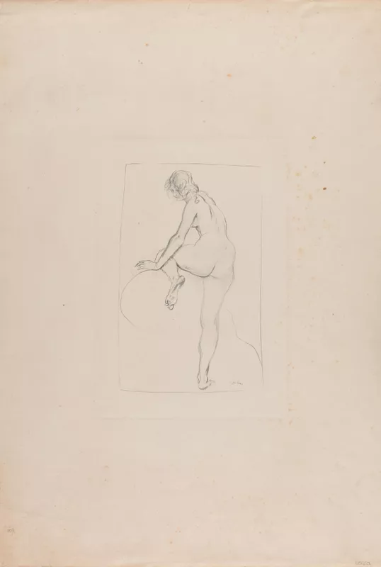 Nude female figure viewed from behind, left leg raised