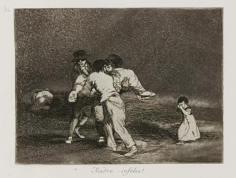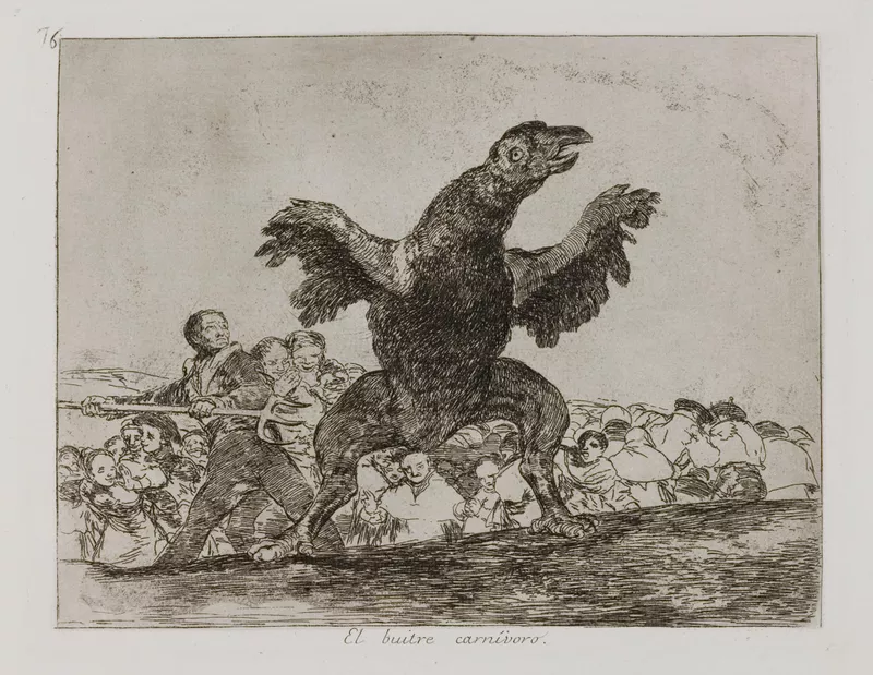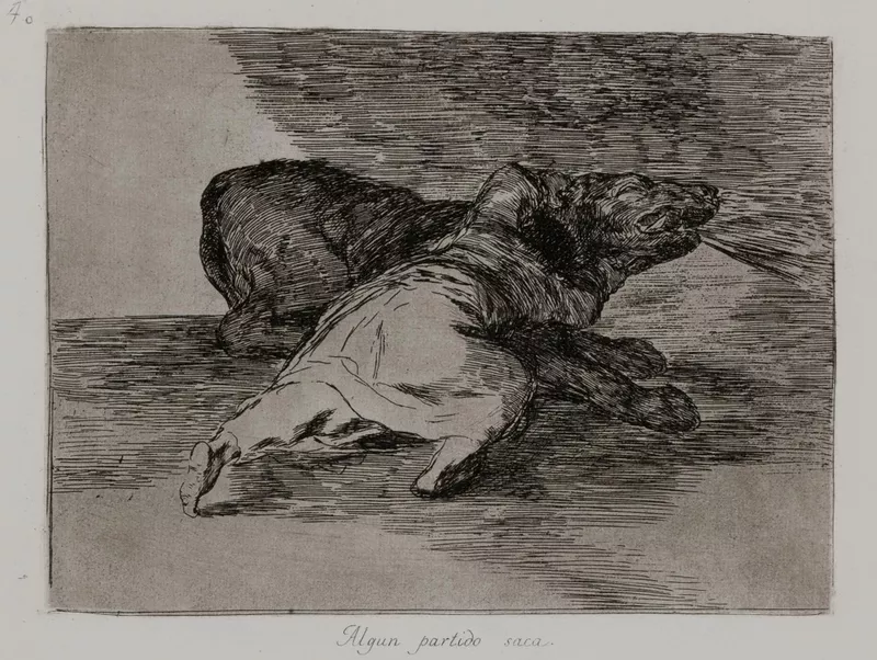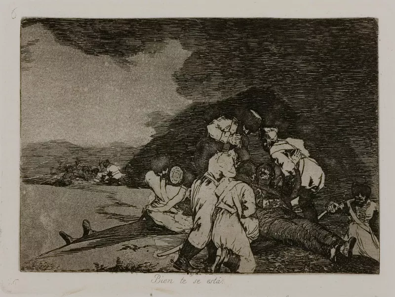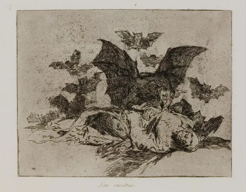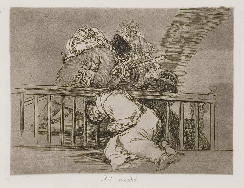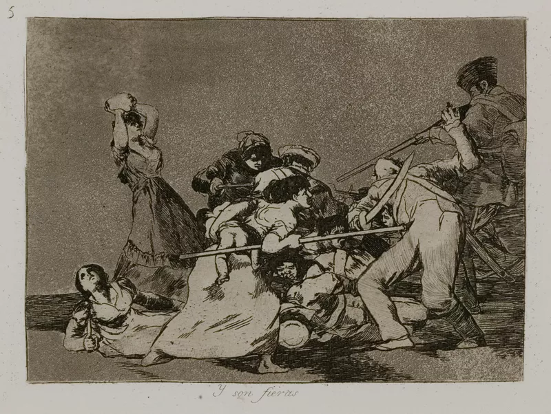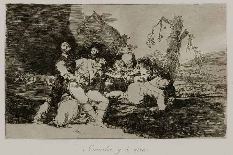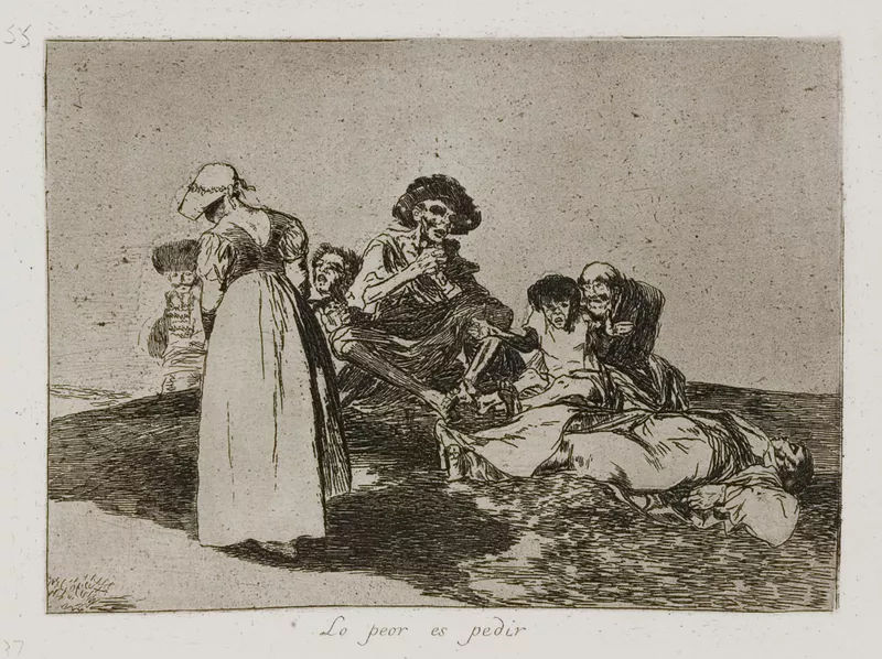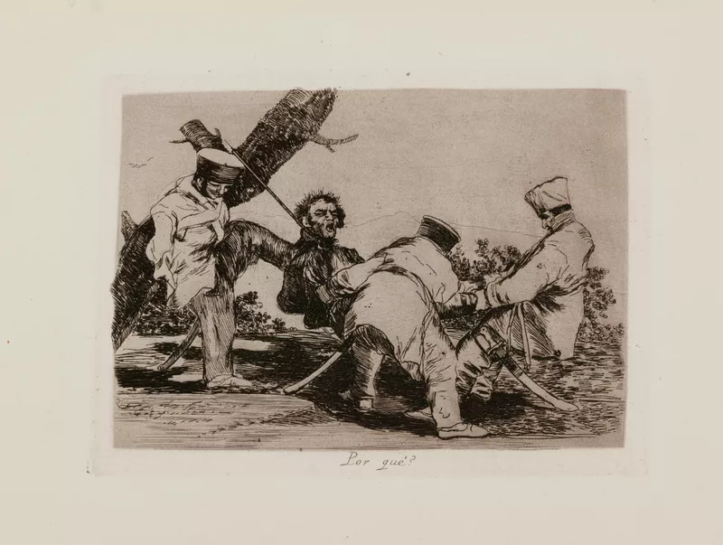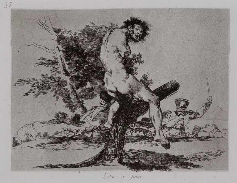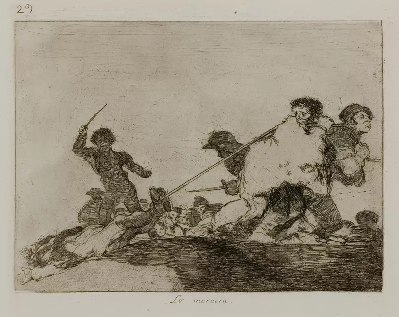 Titled Fatal consequences of Spain’s bloody war with Buonaparte. And other emphatic caprices, the series can be divided into three parts: the first represents scenes of war; the second, the impact of the famine in Madrid; and the third, caprices or fantasies. The last group of prints are allegorical and appear to allude to the repressive regime of Ferdinand VII which followed the war. Goya, fearing persecution from King Ferdinand VII, did not publish Disasters of War during his lifetime.