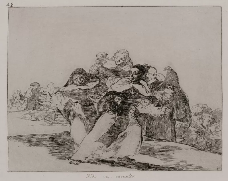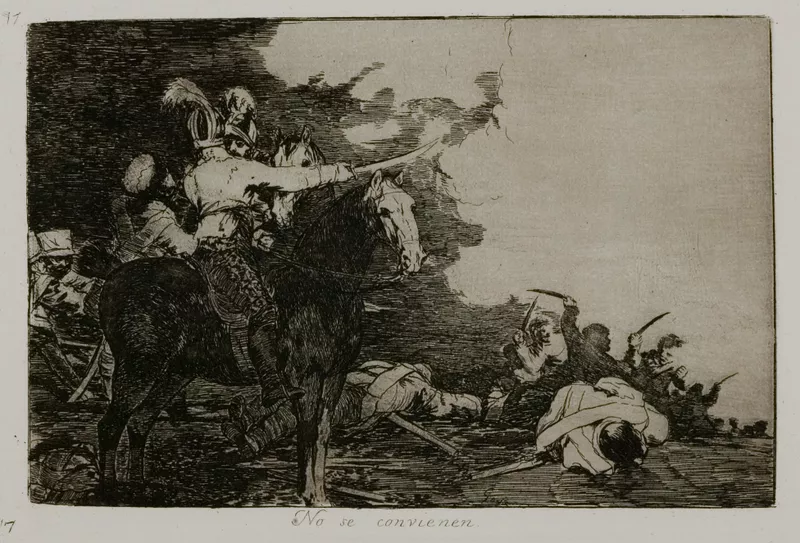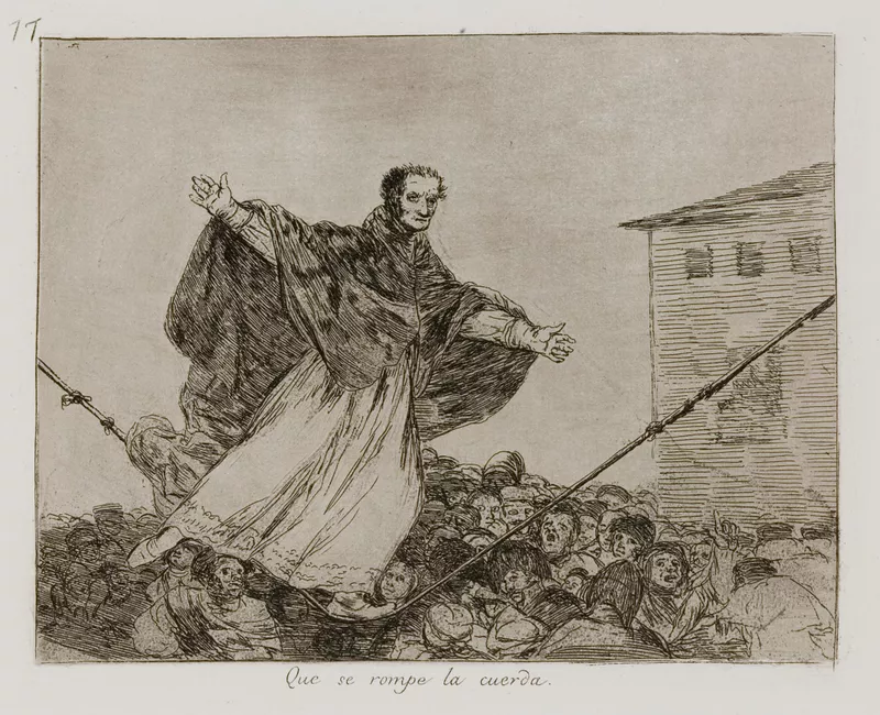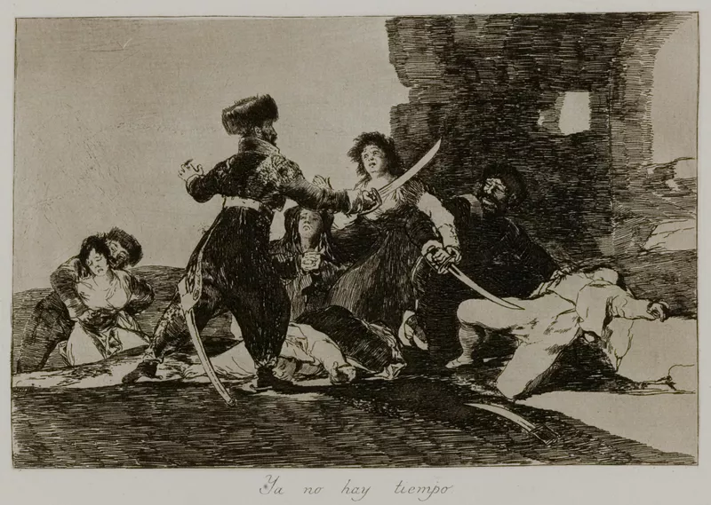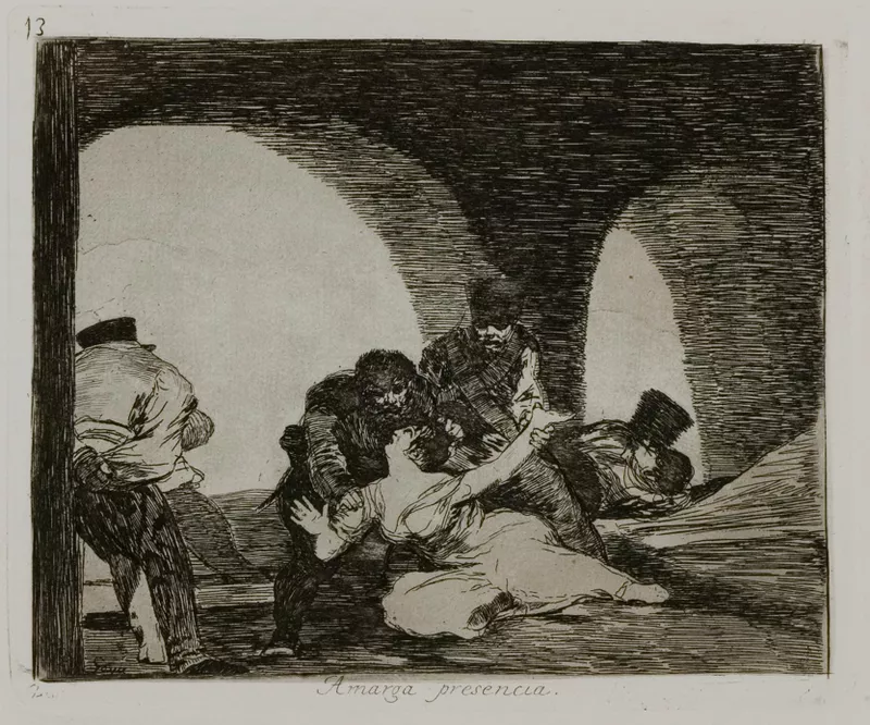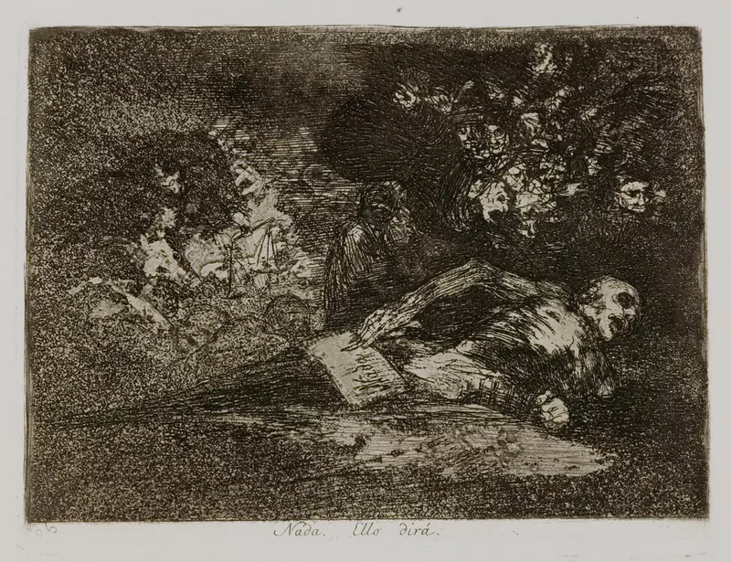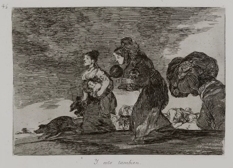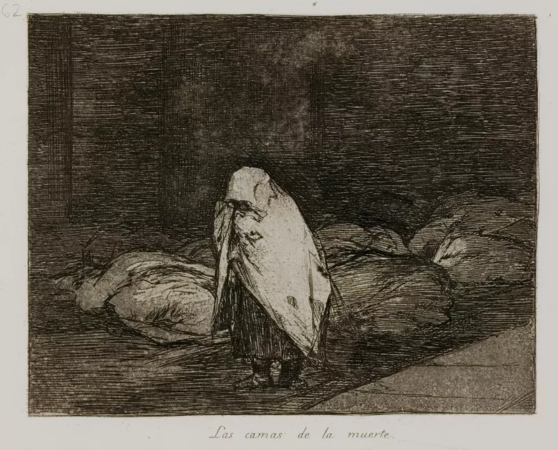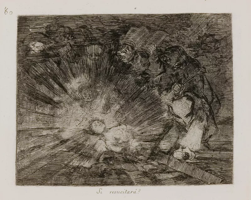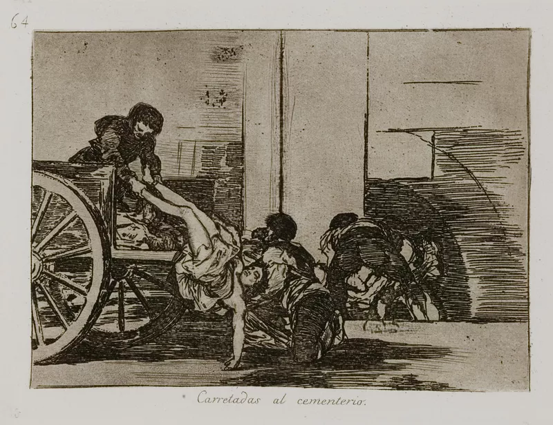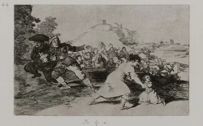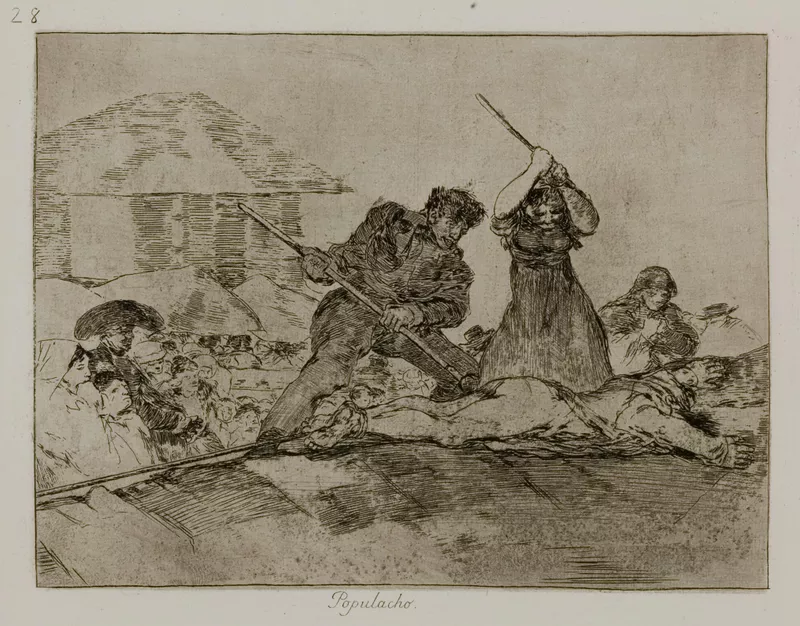 Titled Fatal consequences of Spain’s bloody war with Buonaparte. And other emphatic caprices, the series can be divided into three parts: the first represents scenes of war; the second, the impact of the famine in Madrid; and the third, caprices or fantasies. The last group of prints are allegorical and appear to allude to the repressive regime of Ferdinand VII which followed the war. Goya, fearing persecution from King Ferdinand VII, did not publish Disasters of War during his lifetime.