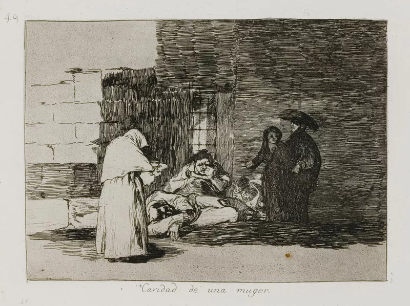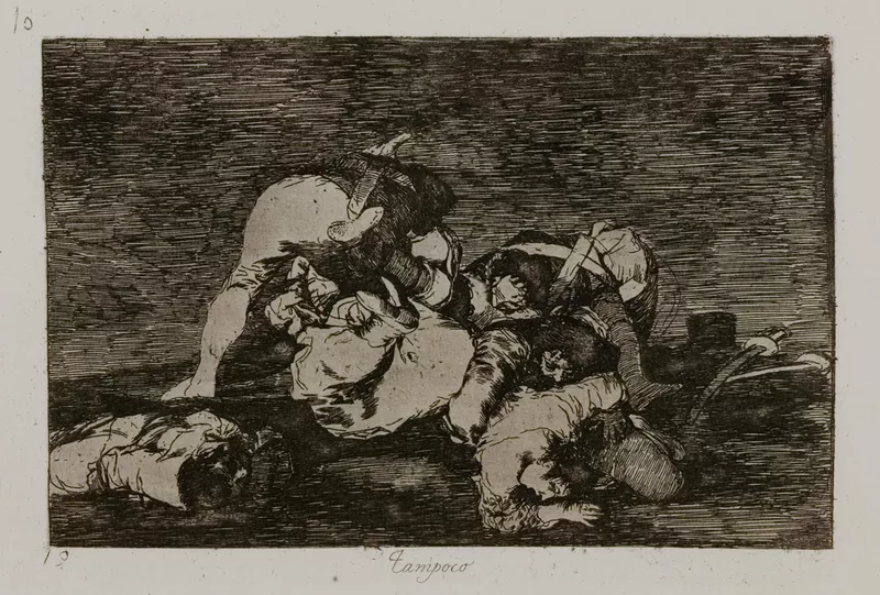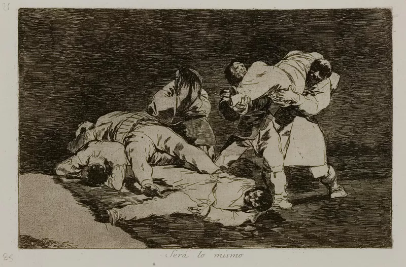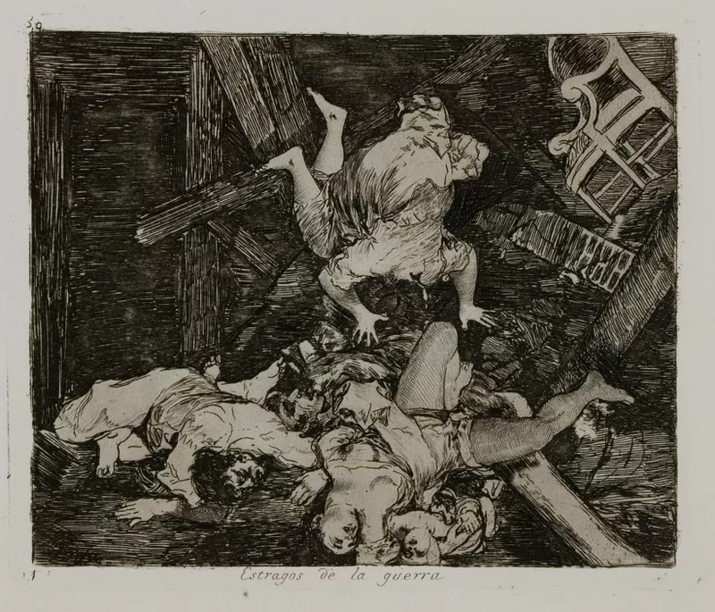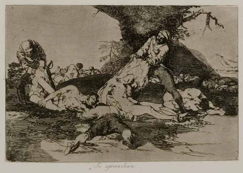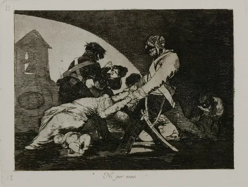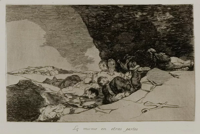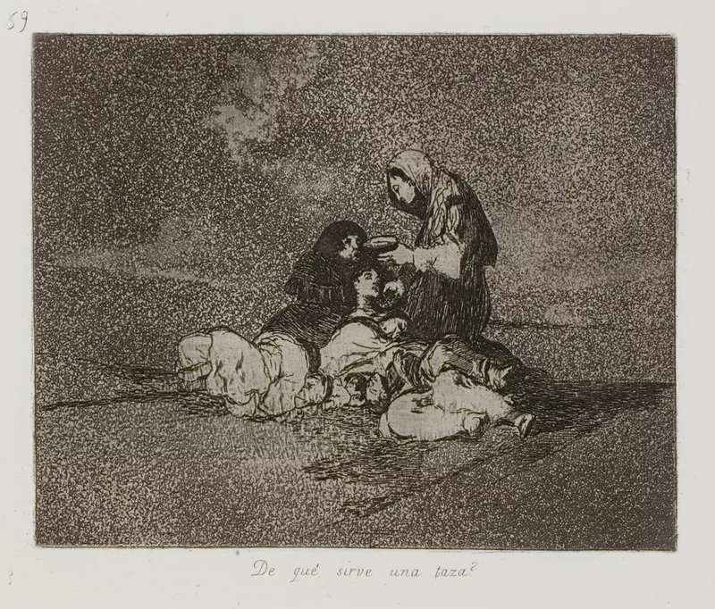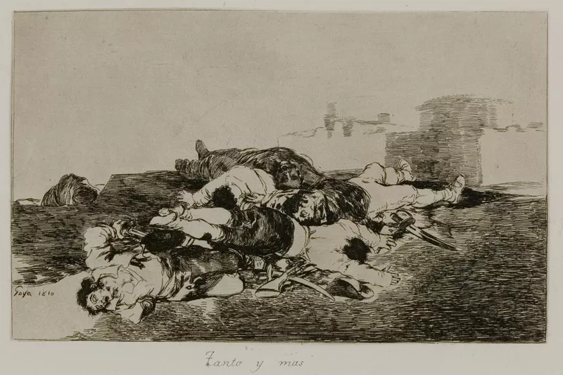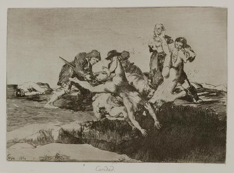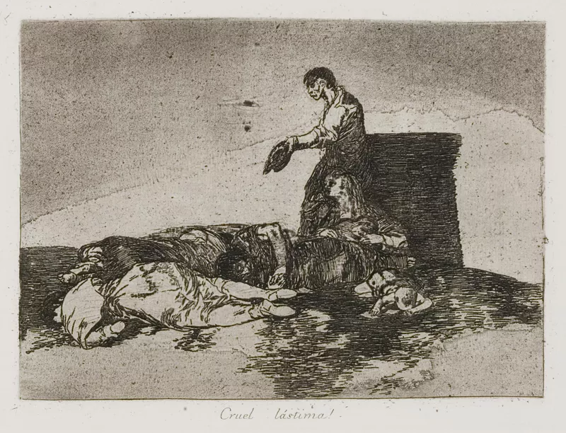 In his prints Goya depicted in unflinching detail the corrosive, dehumanising effects of the conflict on all those affected by the war. Working over ten years, he portrayed the experience of war with an unprecedented directness, exploiting the qualities of etching and aquatint to create a new expressive language. Unlike Jacques Callot’s depictions of war, Goya’s compositions focused on the actions of small groups of people and placed the viewer in the heart of the carnage. The shocking imagery is magnified by Goya’s short and sometimes ambiguous titles, which build a harrowing narrative. Despite Goya’s deep pessimism about human nature, the series ends with a frail statement of hope.