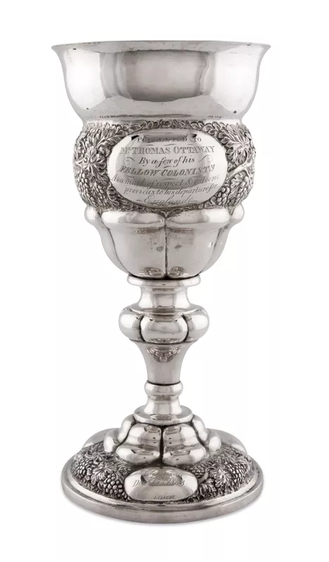 - Stamped to edge of base "[animal head]", '[lion passant]", "[CEF]" Inscribed on the foot of the cup "Adelaide/ Dec'r 15th 1853/ J. CLAUDE"