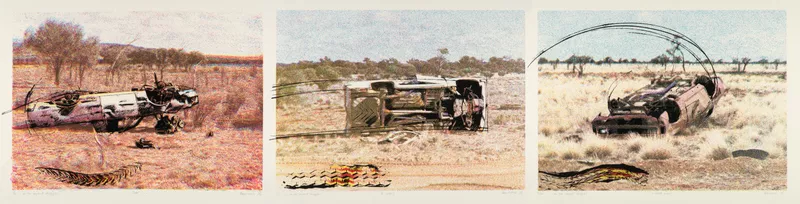 In 1986 Aboriginal issues and injustices inflicted by white Australians became a major focus of Ann Newmarch’s work, inspired (initially at least) by her frequent travel to outback areas, particularly around Coober Pedy, in the mid-1980s. A story related to her by artist Chips Mackinolty also made a lasting impression on her: “I was told of a woman who was out of her camp when white men arrived in trucks and removed all the families to another site. When she came back, she found only the tyre-tread marks and wept because she thought that the Rainbow Serpent has taken all her kin” (artist’s statement, Ann Newmarch: …as the serpent struggles, Ivan Dougherty Gallery, 1988). This story and Newmarch’s first-hand experience of numerous abandoned cars near the Stuart Highway, led to her series of paintings and screenprints …as the serpent struggles, in which wrecked and abandoned cares litter the landscape and tyre marks scarring the landscape metamorphose into the tracks of the rainbow serpent. The cars, as symbols of white technology, refer to European settlers’ intrusion into and disregard for both the landscape and its original inhabitants. The cars were also the means by which white people dislocated Aboriginal people from their ancestral lands and their family or community groups.