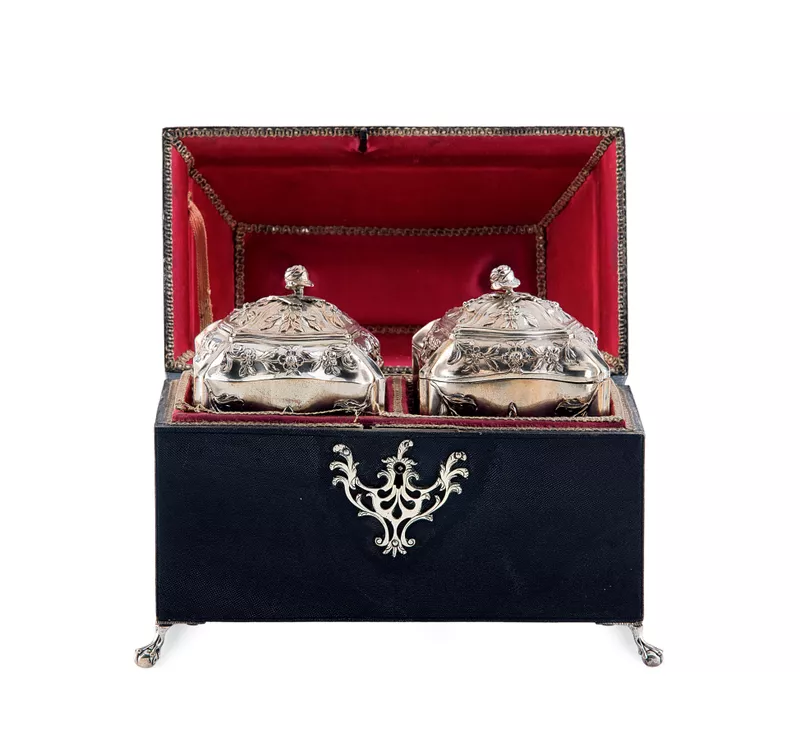 - Each caddy stamped on base "WV/ Q/ [leopard's head crowned]/ [lion passant]". Each cover stamped on flange "[lion passant]". Not dated.
