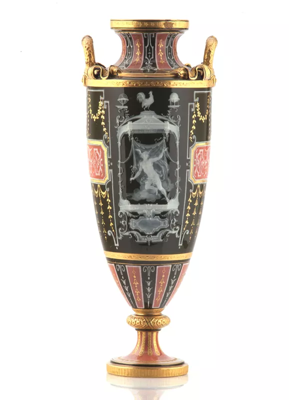 - Printed factory mark on base of each, gold "[crown]/ MINTONS [through a globe]". Impressed on base of each "1013". Signed twice on surface of each "LB".