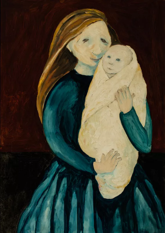 Pauline and Loy, 1947, is one of only a few known oil paintings to be created by leading Melbourne-born artist Joy Hester, whose expressive brush-and-ink drawings on paper are more widely acknowledged. The mother and child scene emerged during a pivotal moment in the artist’s life and was painted in gratitude to the subject, her friend Pauline. Hester, a member of the artist circle known as the Angry Penguins, created this painting soon after receiving her terminal Hodgkins Disease diagnosis at the age of twenty-seven and deciding to leave her artist-husband Albert Tucker and their young son Sweeney. Pauline supported Hester during this period, allowing her to stay in her Fitzroy home, where this work was executed.