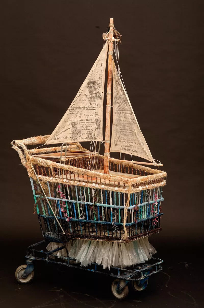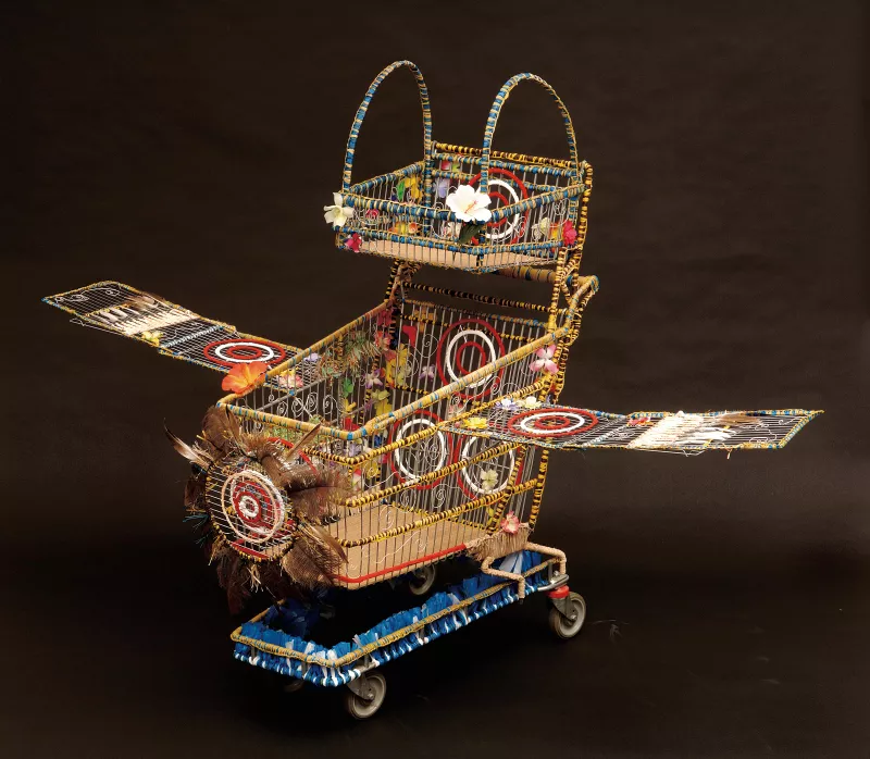 2004plastic bags, seagrass, raffia, rope, string, wire, paint, Queensland emu feathers, bamboo skewers, shells, Erub Island/Torres Strait seedpods, Papua New Guinean wooden spear, linoleumAccession no: 20056S7 -
