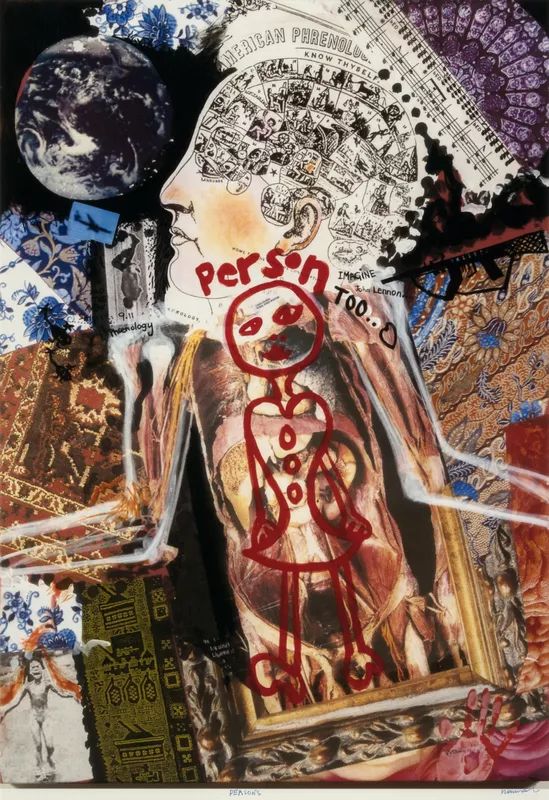 Ann Newmarch began the series Cultural pattern and human fragility (Pandora’s box) in 2008 after being diagnosed with cancer and completed the series while she was recovering. Her ill health and brush with mortality brought about a new way of working where she worked quickly and intuitively collaging together elements drawn from her years of collecting and thinking. As she said: “It’s haptic in a way – I know what the possibilities are but I don’t know the end result in advance. I have to trust myself to know what I am doing. It is both a rational response as well as an emotional one”. When you look beneath the patterning of the shapes and forms, many of the images reference war and also peace, media and found imagery, children’s drawings, remnants of fabric, aspects of her life and health, and lyrics from songs by John Lennon or Leonard Cohen. The small collages were enlarged as digital prints on canvas, and also on paper.