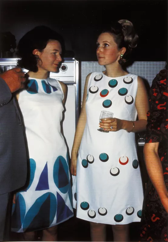 Photograph of Anne Dallwitz and Wendy Wauchope wearing screenprinted chiffon ‘John Dallwitz original design"shifts