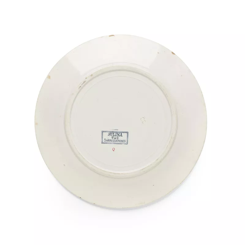 - Base, underglaze blue, 'SULINA', U&C', 'SARREGUEMINES', 'in red, 'Q'.