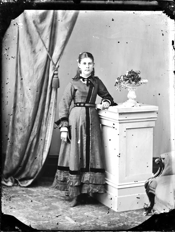 Portrait of girl wearing dress with velvet ribbon detail, arm resting on plinth at right