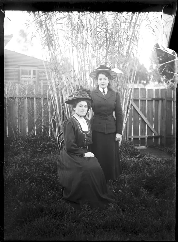 Portrait of two women in outdoor surrounds, bamboo plant in background