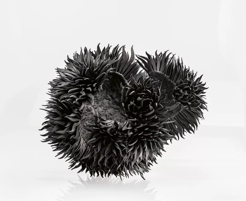 The assemblage of cast and forged metal strips in mild steel and silver to create aggregated spiny vessels and sculptures is central to the practice of the contemporary craftsperson Junko Mori. Trained as a blacksmith in Tokyo, she draws on her Japanese cultural heritage and the traditions of her adopted country of Britain to create original forms using repetitive and painstaking metalwork processes. Propagation Project: Windy Leaf demonstrates Mori’s signature style: its lightness of form belies its sheer weight in steel, reflecting her ability to manipulate this unyielding material.