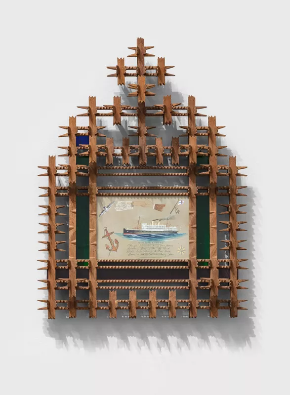 cedar frame, coloured glass, ink, coloured wash drawing on paper
