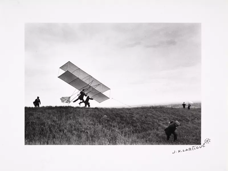 The young photographer Jacques Henri Lartigue and his older brother Zissou dreamed of flying and in 1910 Zissou built a glider based on that of the Wright brothers. He tested it on a windy day in the park at Rouzat. Lartigue’s photograph and diary entry record the success of his brother’s second attempt: