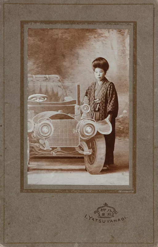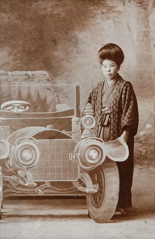 School girl beside studio prop car