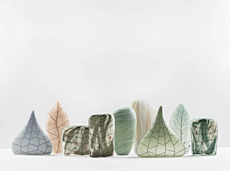 Clare Belfrage has spent her career transforming the rhythms, patterns and textures found in the natural world into vitreous vessels. Using techniques achieved through decades of practice, Belfrage produces delicate, translucent leaf-like glass forms that highlight her highly developed skills and meticulous attention to detail. Working with apparent ease with the often-stubborn and erratic material of glass, Belfrage applies layers and layers of fine threads of glass onto blown forms to realise the striking effects for which she has become known.
