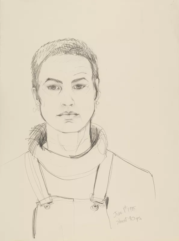 Ann Newmarch regularly made self portraits throughout her career. Most had been private works, mainly drawings, made partly to keep working in between series of works, inspired by Rembrandt’s achievements in this genre. From when she turned forty, in 1985, her self portraits became more public works, presenting a mature exploration of her identity and her heightened awareness of her ageing and own mortality. This pencil drawing was created just before her fortieth birthday.