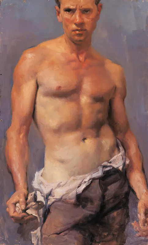 Self-portrait, c.1935, is a rare early example of Hele’s more personal painting practice, executed outside his commissioned work. The self-portrait depicts the artist intensely engaged in the act of painting in his repurposed studio in Aldinga, a small town forty-five kilometres south of Adelaide. Standing with rag in hand and bare-chested, his focused gaze is absorbed in studying his own mirror image, bringing to mind the artist’s own words when describing his painting process: ‘while I’m [painting a portrait] I’m obsessed with that one thing’. Embodying a sense of youthful, daring energy, this early self-portrait captures the artist in his early twenties, on the cusp of his high-profile and active artistic career.