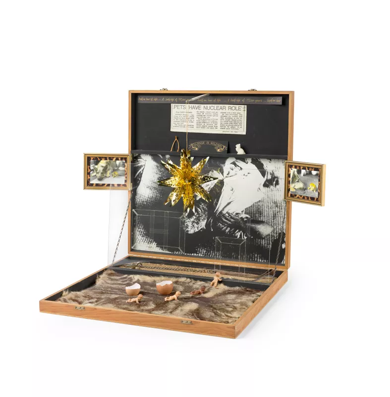 cat skin, plastic dolls, egg shells, Perspex, dog leashes, sand, glitter, photocopies, wishbone, ceramic ornament, gold ink on black cardboard, hand-coloured gelatin-silver photographs, star decoration in wooden box