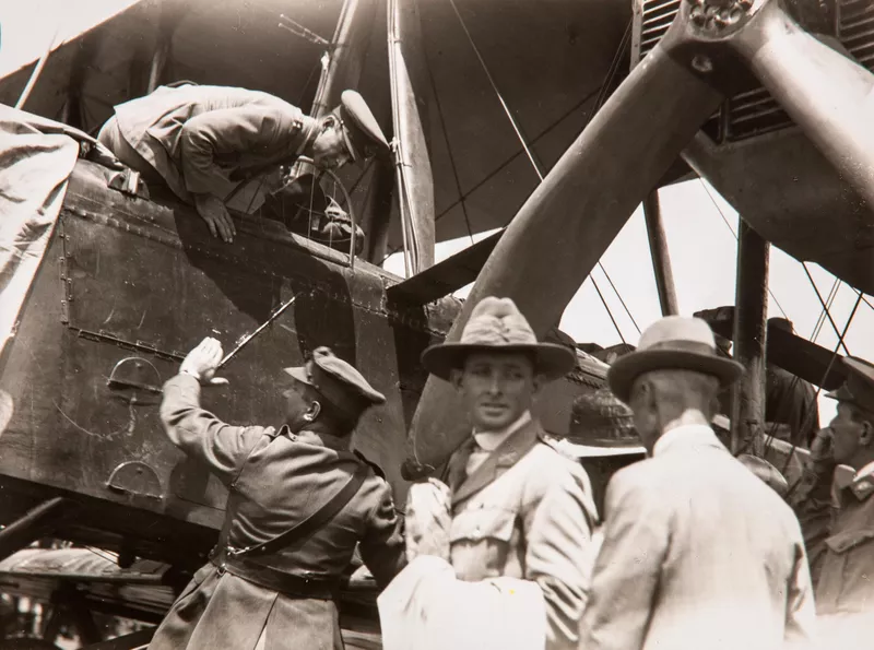Sir Ross Smith looking down from cockpit of the Vimy (his father, Mr Andrew Smith with back to camera on right)