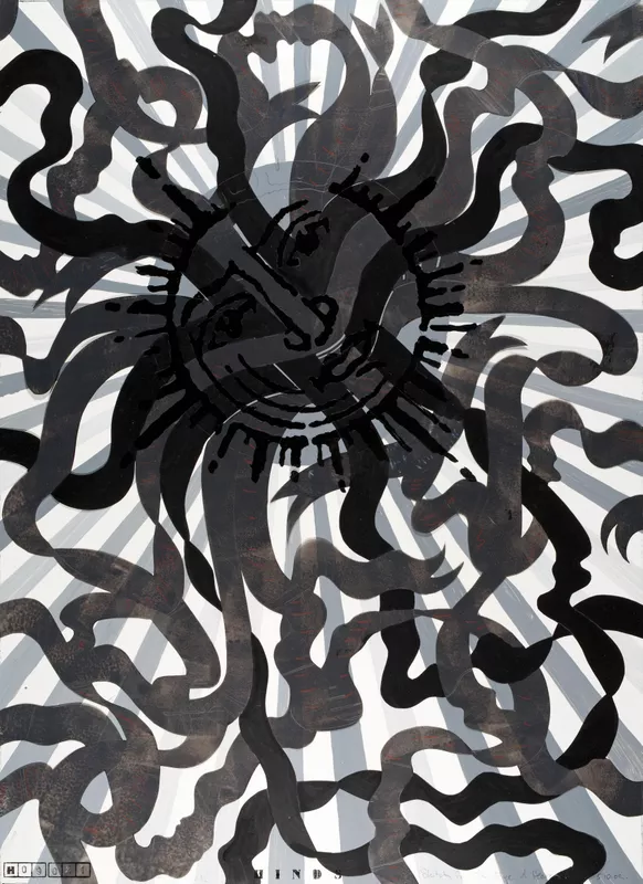 John Hinds 1950coloured pencils, pencil, synthetic polymer paint on tracing paper, stapled over photographic paper with felt-tipped pen and synthetic polymer paintAccession no: 20223D42