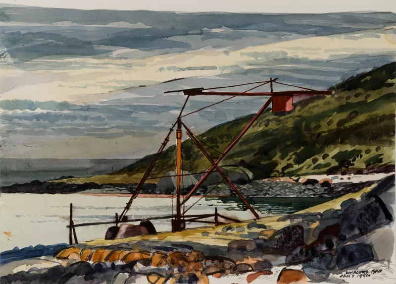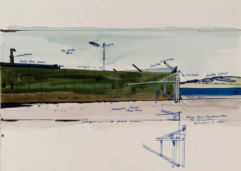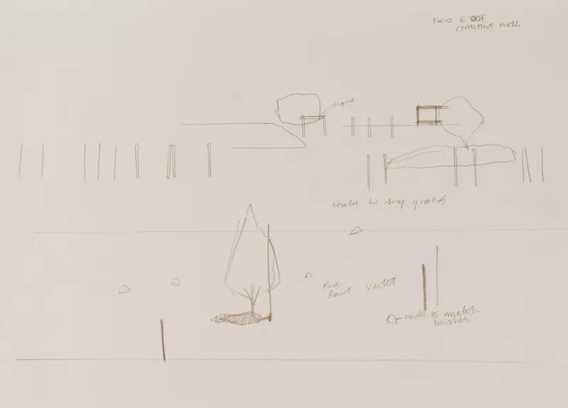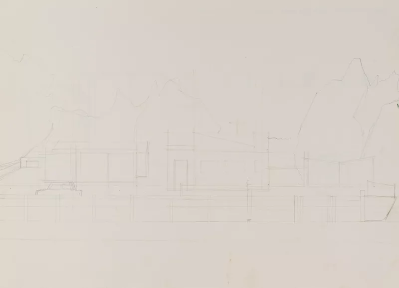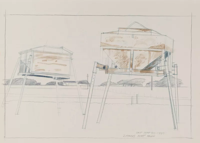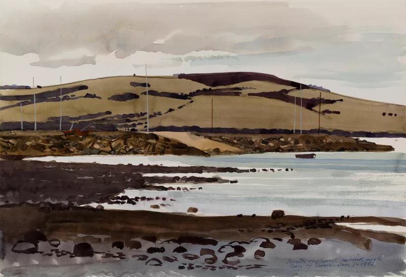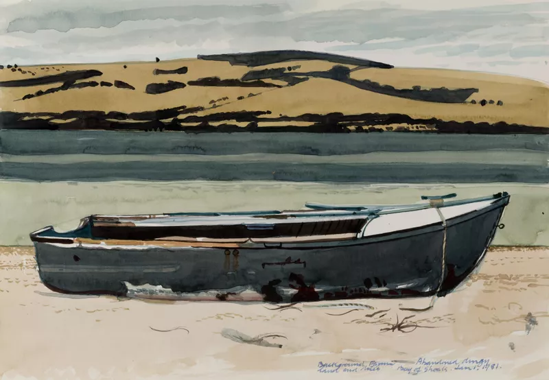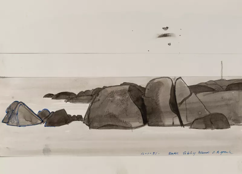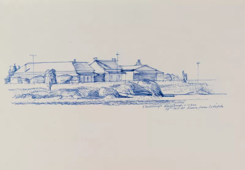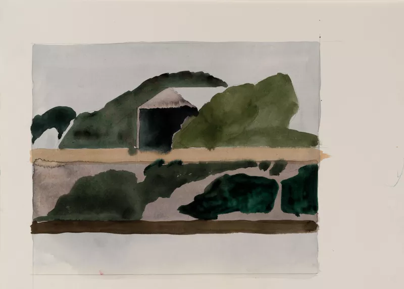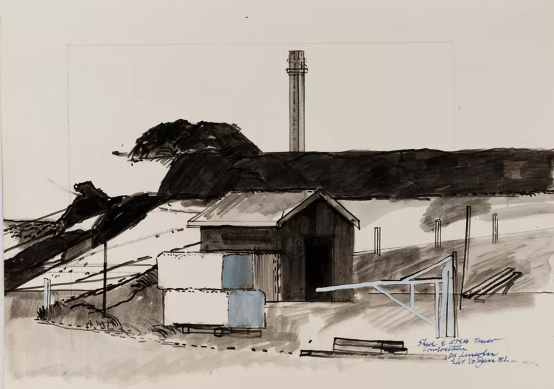 - brush & ink, pen & blue, grey & black inks, watercolour, coloured pencil on paper