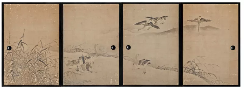 Sliding doors (fusuma) with mountain landscape, reeds and geese.